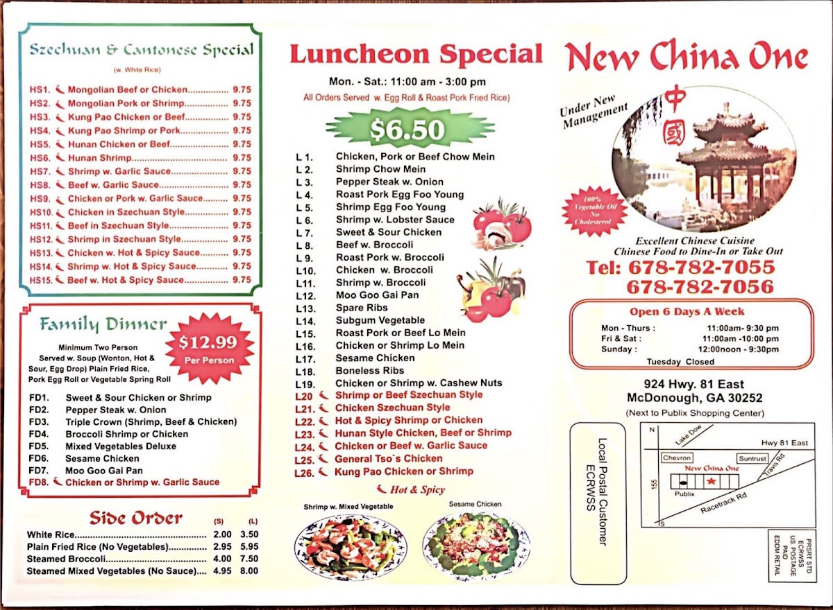 Welcome to **New China 1**, a delightful culinary haven located at 924 Hwy 81 East in McDonough, GA. This gem stands out with an extensive menu that promises to tantalize your taste buds.